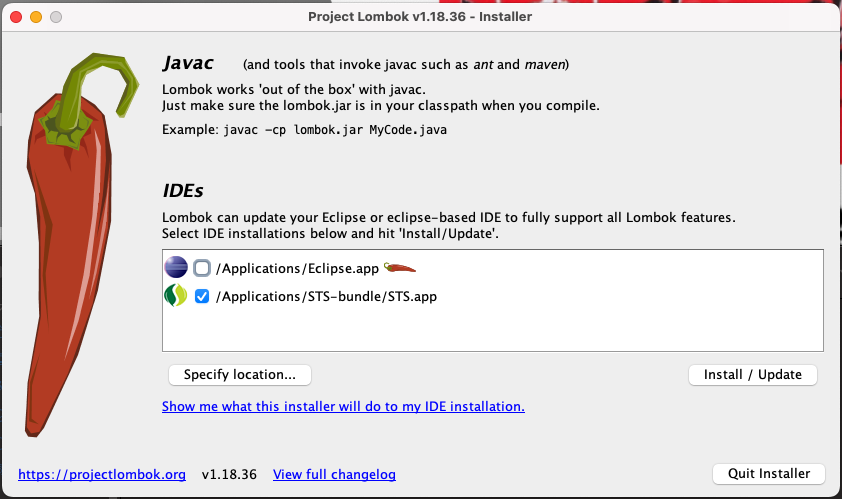 넣는 방법 : 응용프로그램에서 STS찾아서 우클릭 > 패키지내용보기 > Contents > Eclipse 폴더 안에 lombok.jar 넣기