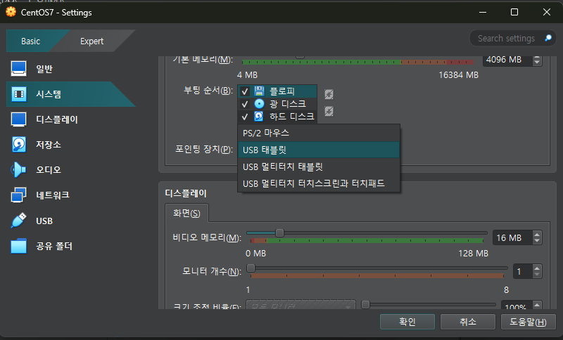 환경설정 > 시스템 > 포인팅 장치 USB 태블릿으로 바꿔주기