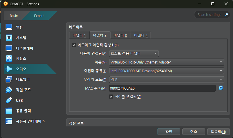 어댑터2 > 네트워크 어댑터 활성화하기 > 다음에 연결 호스팅 전용 어댑터 >
