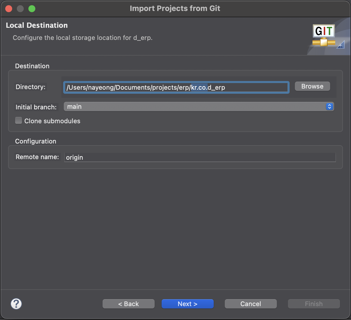 클론할때 경로를정하면서 동시에 프로젝트명을 제대로 설정하면서 클론해야함