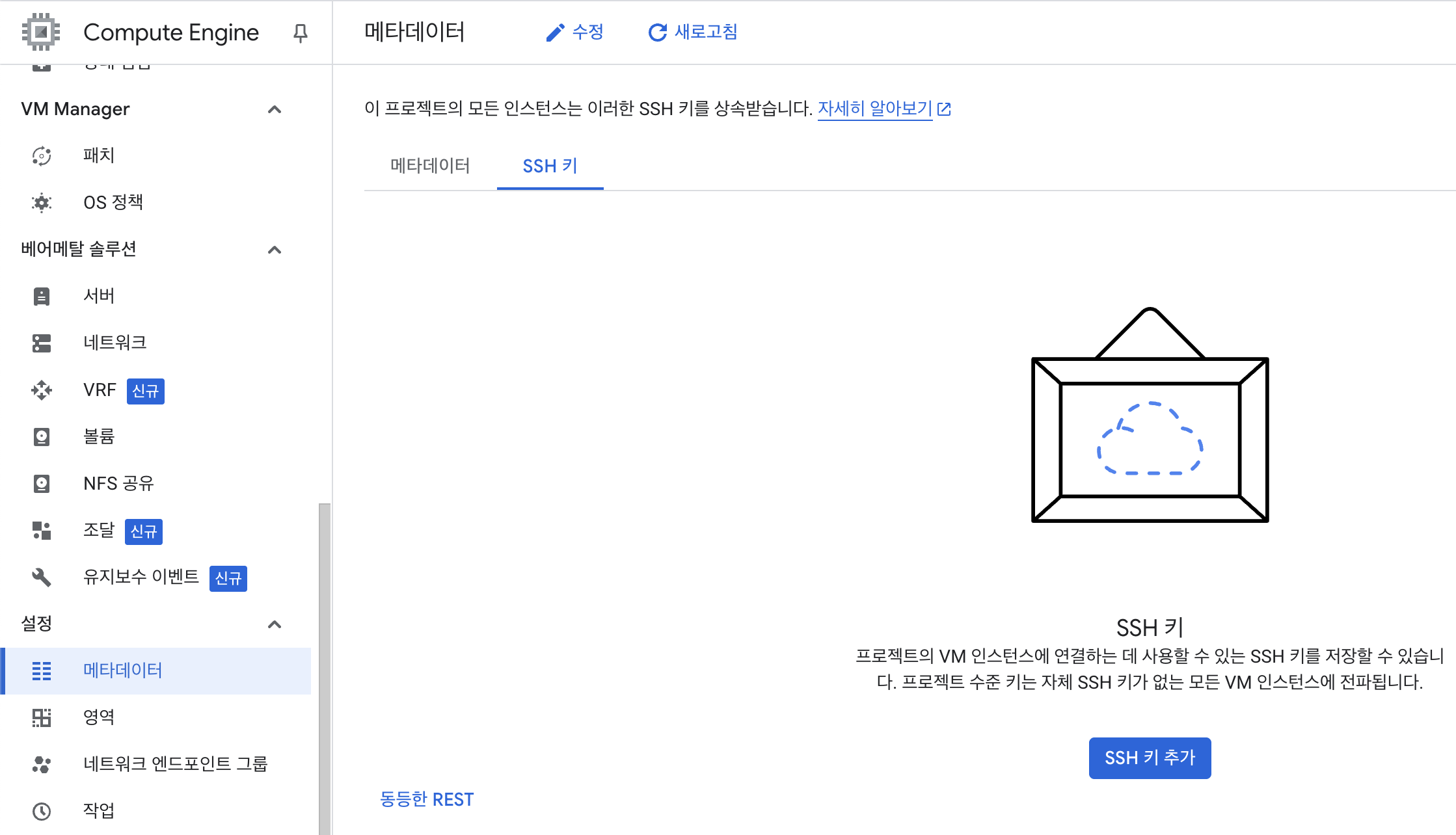 컴퓨트엔진 > 설정 > 메타데이터 > SSH 키 > SSH키 추가